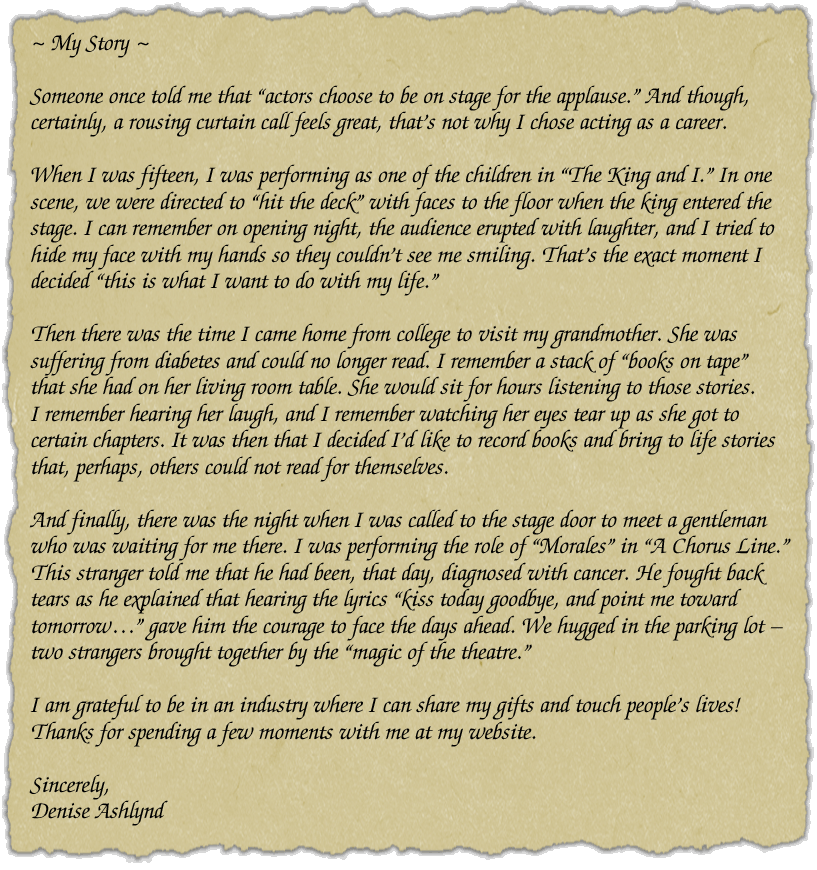 Denise Ashlynd brings over 30 years of professional experience to her work in theatre, film, television, commercials, and voice-over. A native of Florida, she made her television debut on "Romper Room" at the age of 5. By age 13, she performed on stage in her first Equity production of "Fiddler on the Roof." Denise graduated magna cum laude from Florida State University with a B.F.A. degree in Music Theatre. While at FSU, she worked and studied with Joseph Papp, Roger Rees, Raul Julia, Nigel Rideout, and Neal Kenyon. She also had the privilege of working with Academy Award winning director, Jonathan Demme, on his film "Something Wild," which was shooting in Tallahassee at the time.Just after graduation, Denise earned her Equity card and moved to NYC, where she continued her training at Circle in the Square. On stage, she has performed Off-Broadway, in U.S. tours, regionally, and throughout 13 countries in Europe in productions of "Man of La Mancha" (starring John Raitt), "Hair," "Jesus Christ Superstar" and Alan Johnson's "West Side Story" to name just a few. Most recently, she shared the "Swamp Radio" stage with Emmy Award winning actor, Michael Emerson.